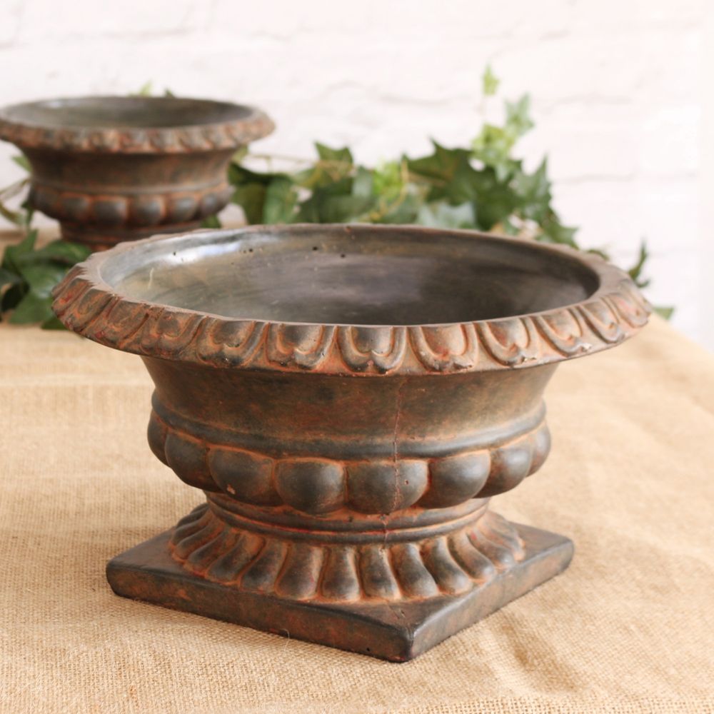 French inspired urn flower planter pot aged in colour shades of brown. Perfect for wedding arrangements, event decor, hotels, restaurants and home gardens.