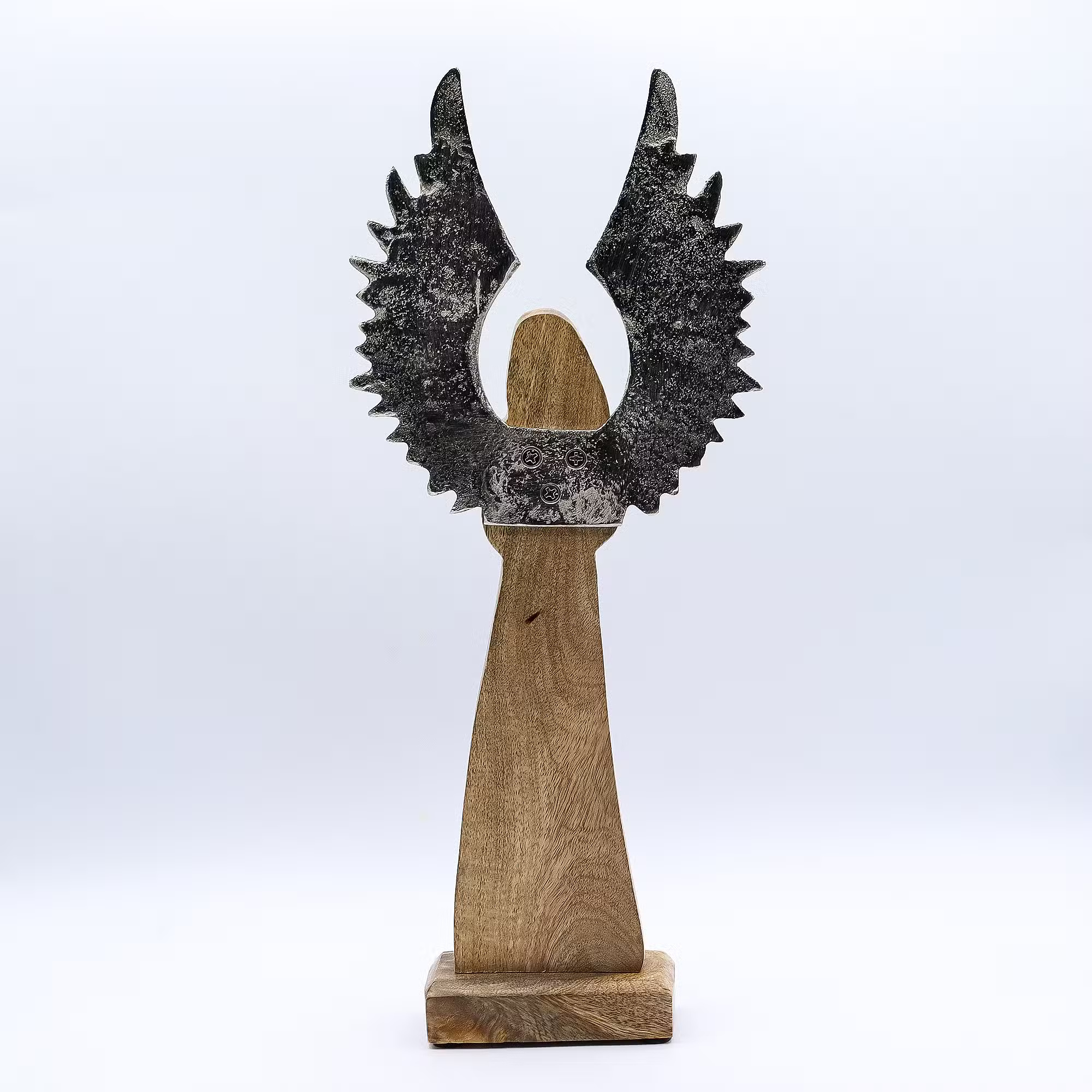 Standing 40cm tall, this hand-carved guardian angel makes a bold and graceful statement. Crafted from mango wood with silver-toned metal wings and a flowing robe finished in deep black enamel, it radiates strength, elegance, and protection.